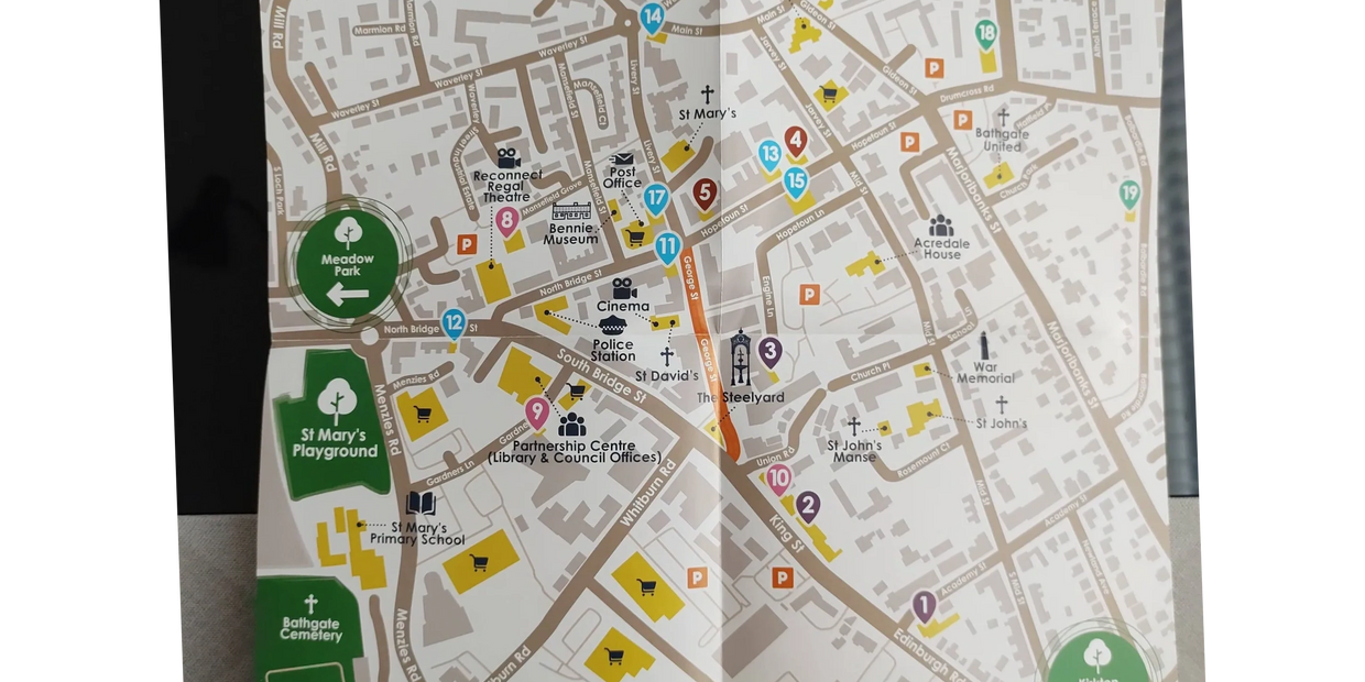 This handy A5 sized map folds out to an A3 size to guide visitors to the town centre and its attractions and services. Car Parks and supermarlkets are marked along with hotels and pubs and clubs. It also identifies our two banks and the petrol stations in the centre and gives a handy web site address for a guide to Bathgate Restaurants. The Library holds copies for the public.